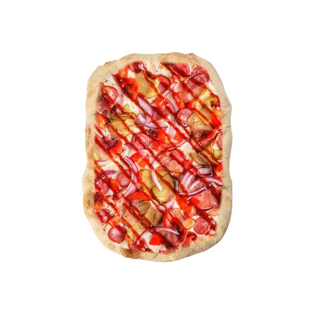 Тесто дрожжевое, крупа манная, сос томатный с травами, сыр моцарелла, бекон, колбаски говяжьи, огурцы маринованные, перец болгарский, лук красный, перец черный молотый, соус барбекю. *На предприятии используются: горчица, орехи, кунжут, арахис, злаки, содержащие глютен, молочные и соевые продукты яйца, сельдерей, рыба и продукты их переработки.