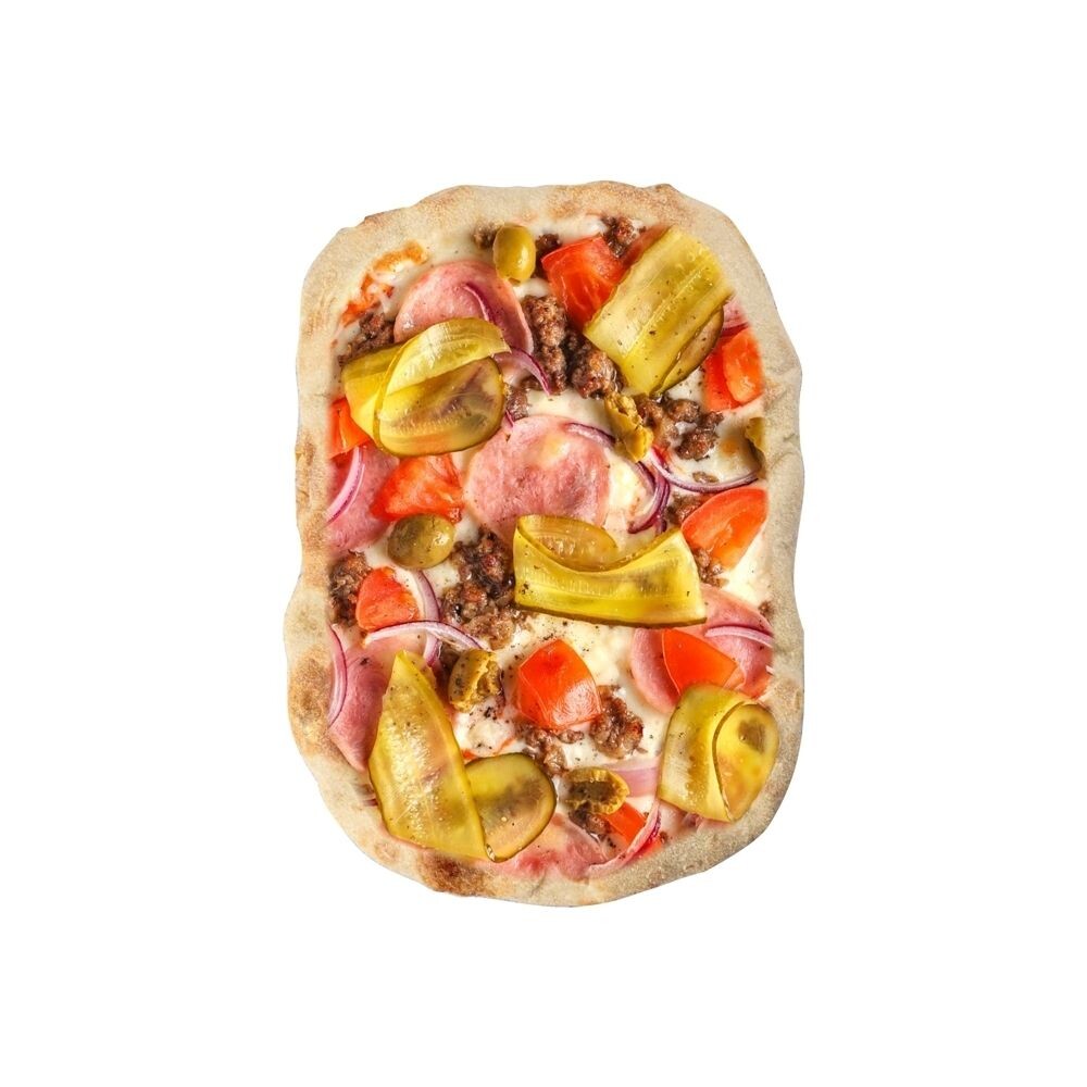 Тесто дрожжевое, крупа манная, соус томатный, соус сливочный (на основе сливок), сыр моцарелла, фарш говяжий, ветчина (свинина), огурцы солёные, томаты, оливки, перец черный молотый, лук красный. *На предприятии используются: горчица, орехи, кунжут, арахис, злаки, содержащие глютен, молочные и соевые продукты яйца, сельдерей, рыба и продукты их переработки.