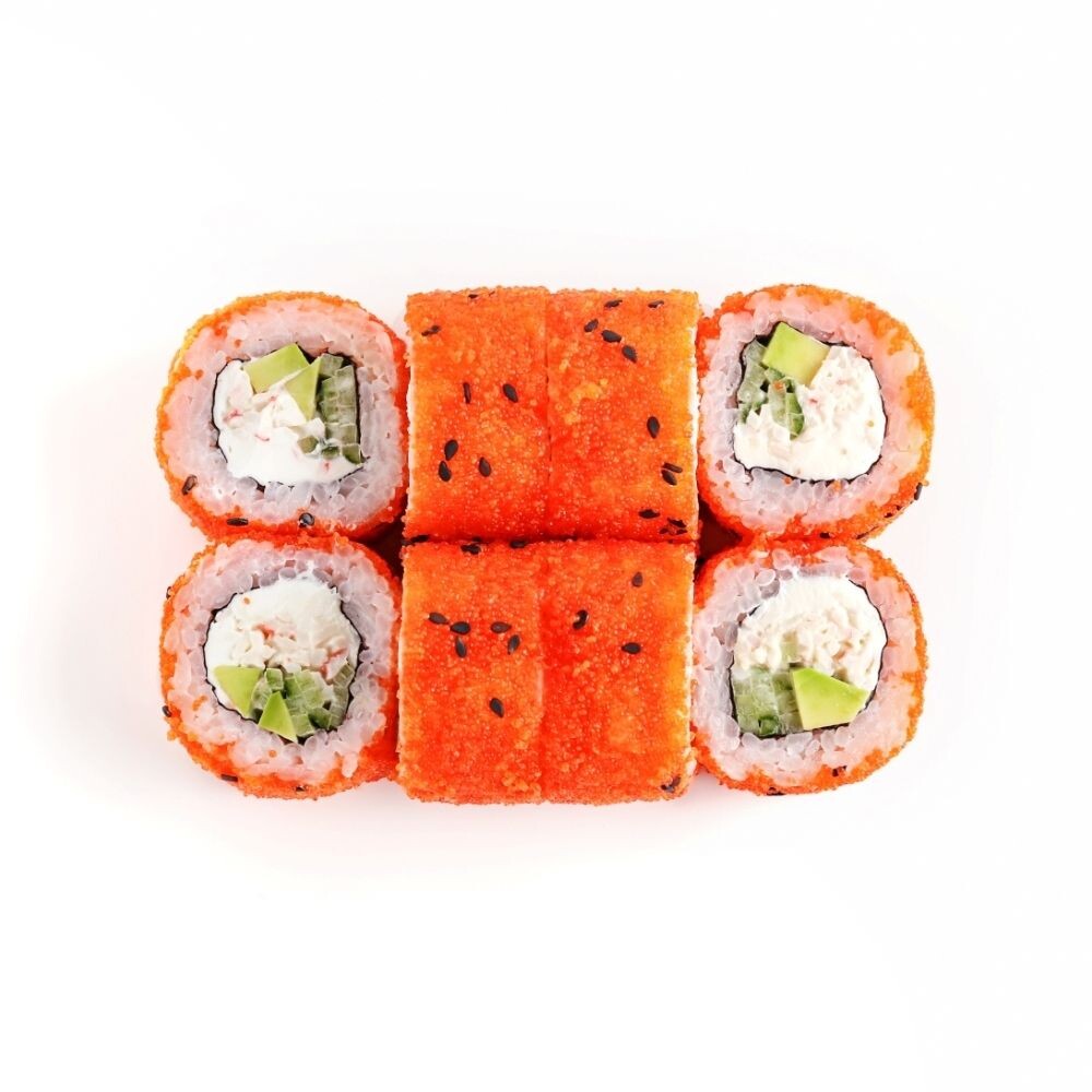 Рис, уксус рисовый, сахар, водоросли нори, снежный краб, домашний майонез, огурец, икра масаго, кунжут. Включено: Соевый соус 1 порция, палочки для суши 1 комплект.*Блюда готовятся на предприятии где используются морепродукты и их переработки, ракообразные, кунжут, лактоза, глютен. В рыбе и курице могут быть незначительное количество частиц костей.