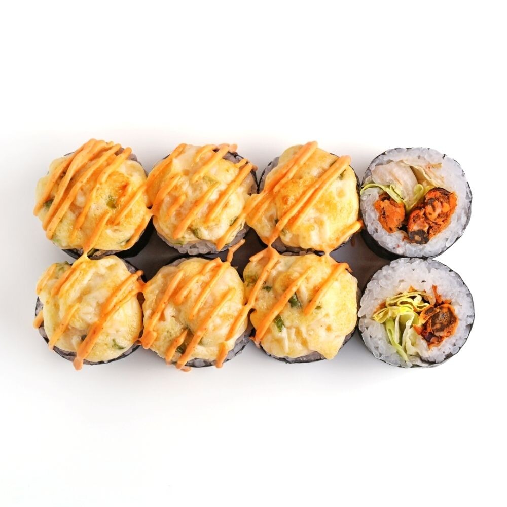 Рис, уксус рисовый, сахар, водоросли нори, мидии, соевый соус, листья салата, соус беб (домашний майонез, сыр, чеснок, лук зелёный), соус спайси (домашний майонез, шрирача, ким-чи, чеснок, кунжут), Включено: Соевый соус 1 порция, палочки для суши 1 комплект.*Блюда готовятся на предприятии где используются морепродукты и их переработки, ракообразные, кунжут, лактоза, глютен. В рыбе и курице могут быть незначительное количество частиц костей.
