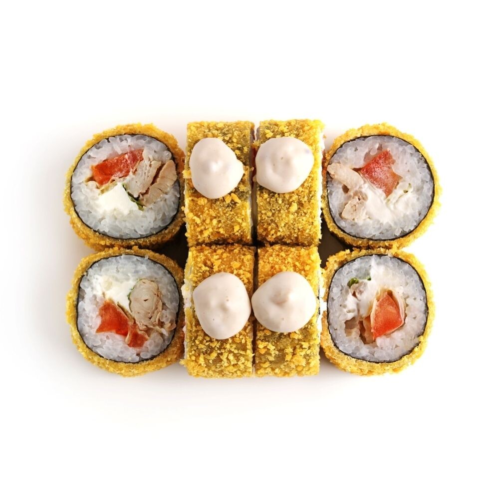 Рис, уксус рисовый, сахар, водоросли нори, курица су-вид, томаты красные, сыр творожный, лист салата, кляр темпура, панко, соус цезарь (яйцо куриное, анчоусы, чеснок, соевый соус, горчица, сыр пармезан, масло растительное, сок лимона). Включено: Соевый соус 1 порция, палочки для суши 1 комплект.*Блюда готовятся на предприятии где используются морепродукты и их переработки, ракообразные, кунжут, лактоза, глютен. В рыбе и курице могут быть незначительное количество частиц костей.