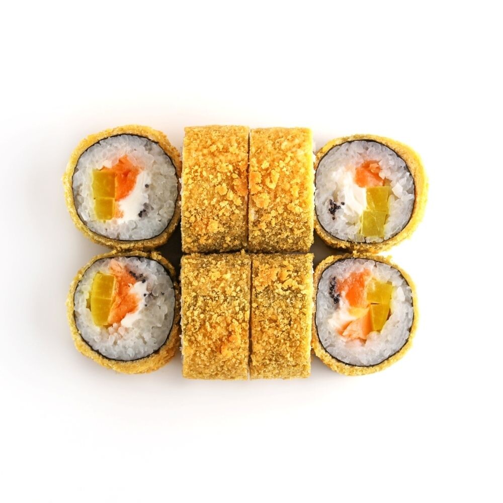 Рис, уксус рисовый, сахар, водоросли нори, филе лосося слабосолёное, дайкон, сыр творожный, кляр темпура, панко, икра масаго. Включено: Соевый соус 1 порция, палочки для суши 1 комплект.*Блюда готовятся на предприятии где используются морепродукты и их переработки, ракообразные, кунжут, лактоза, глютен. В рыбе и курице могут быть незначительное количество частиц костей.